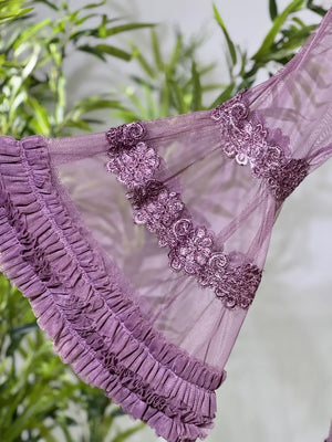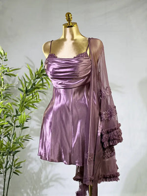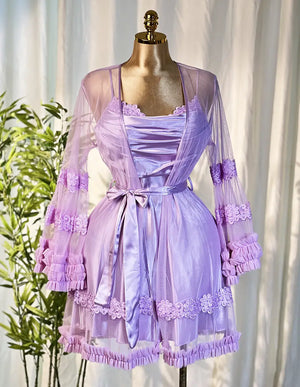 طقم صباحية مكوّن من قميص ستان مستورد ملمسه ناعم وانسيابي على الجسم، بخامة خفيفة ومريحة للّبس داخل البيت. ومعاه روب قصير من التول شفاف خفيف يدي طبقة شكل مختلفة ويكمل الطقم بشكل أنيق. تفاصيل الدانتيل على الحواف بتضيف لمسة مرتبة من غير مبالغة، والتشطيب معمول بعناية علشان يبان الطقم نظيف وراقي في اللبس.