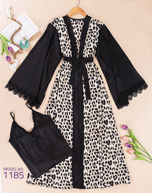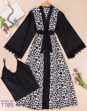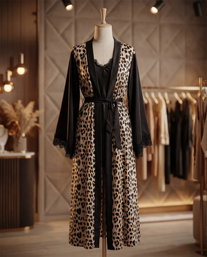 طقم مكوّن من قميص + روب طويل بخامة ستان مستورد ناعمة وملمسها حريري خفيف على الجسم. تصميم الروب الطويل بياخد شكل مرتب على اللبس ويدي إحساس فخم من غير ما يكون تقيل، مع نقشة تايجر مميزة متوفرة بلونين: تايجر ورصاصي—اختيارين شكلهم قوي وواضح في التفاصيل. القميص قصّته مريحة وسهلة اللبس، والستان بيدّي الطقم لمعة هادية وتشطيب نظيف يبان من أول مرة.