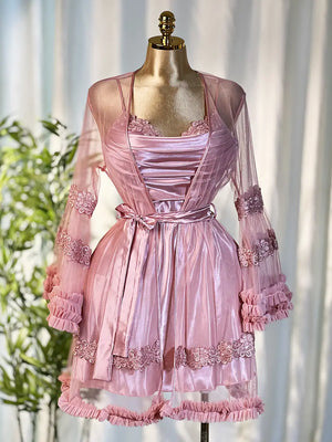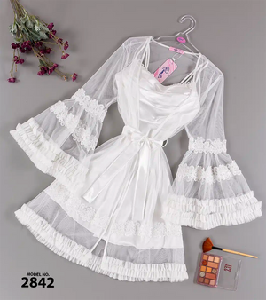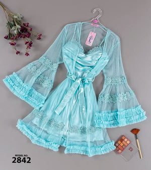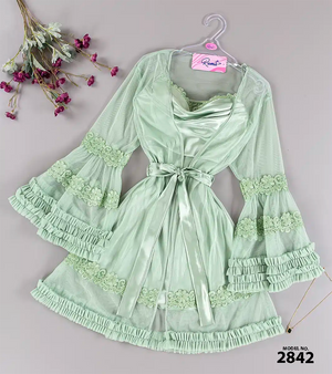 طقم صباحية مكوّن من قميص ستان مستورد ملمسه ناعم وانسيابي على الجسم، بخامة خفيفة ومريحة للّبس داخل البيت. ومعاه روب قصير من التول شفاف خفيف يدي طبقة شكل مختلفة ويكمل الطقم بشكل أنيق. تفاصيل الدانتيل على الحواف بتضيف لمسة مرتبة من غير مبالغة، والتشطيب معمول بعناية علشان يبان الطقم نظيف وراقي في اللبس.